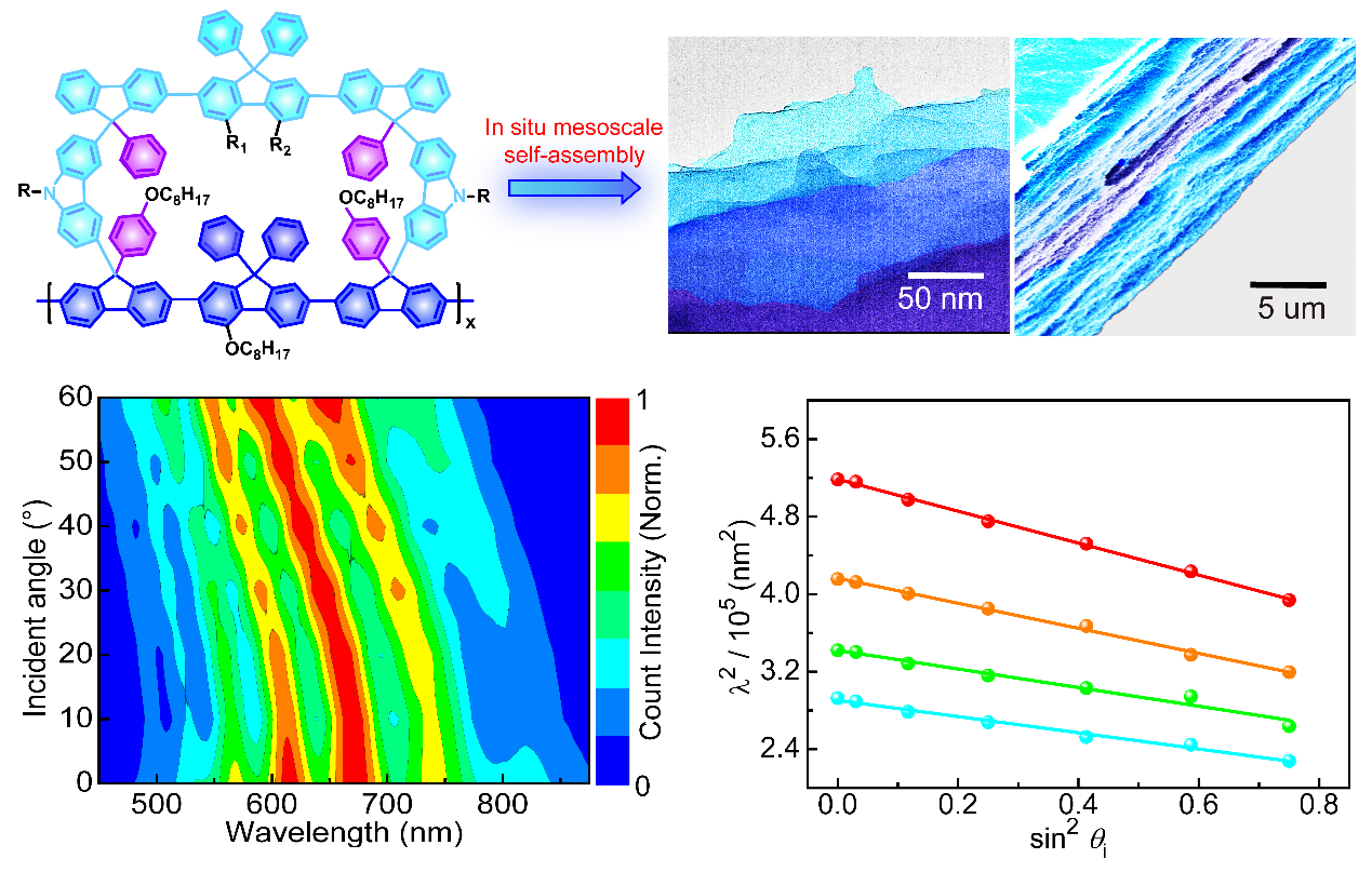 在本工作中,研究人员发现,相比于非格的π-共轭聚芴骨架,共轭聚格既可借助格芳烃单元的超位阻效应抑制链间聚集过程,又凭借共价锁定特征抑制构象平面化与结晶化,进而介观组装形成了具有层层堆积结构的透明光学薄膜。通过角分辨反射谱观察到一系列的光学干涉条纹,这些干涉条纹具备角度依赖的蓝移特征,满足Bragg-Snell衍射方程,从而证实了光子晶体的性质。