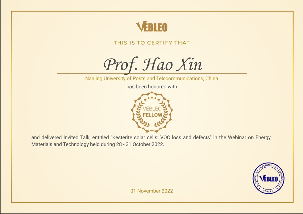 辛颢教授长期致力于光电功能材料及应用研究。以第一作者或通讯作者身份在Nature Energy、Energy & Environmental Science、Journal of American Chemical Society等国内外刊物发表SCI论文70余篇,授权专利十余项。辛颢教授此次获得Vebleo Fellow荣誉称号,标志着88858cc永利官网在薄膜太阳能电池领域的科研工作获得国内外同行的高度认可,进一步提升了88858cc永利官网的国际影响力。