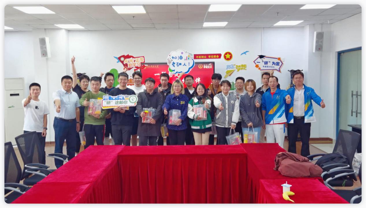 随后,学院领导为在场考研学子发放精心准备的慰问品,传递来自学院的真挚祝福。考研慰问品取意“事事顺意”,祝福化生院考研学子“考研顺利”:水果“橙”子——寓意马到“成”功;孔庙祈福文具——祈福学生考出好成绩,书写人生华章;乐事“薯”片——寓意一战成硕,必“属”于你。最后,学院老师与全体考研学子合影,齐声高呼:“化生万物,学致无穷。一往无前,终成所愿!”,记录下2024届考研学子的决心与勇气。