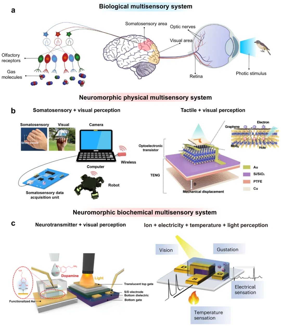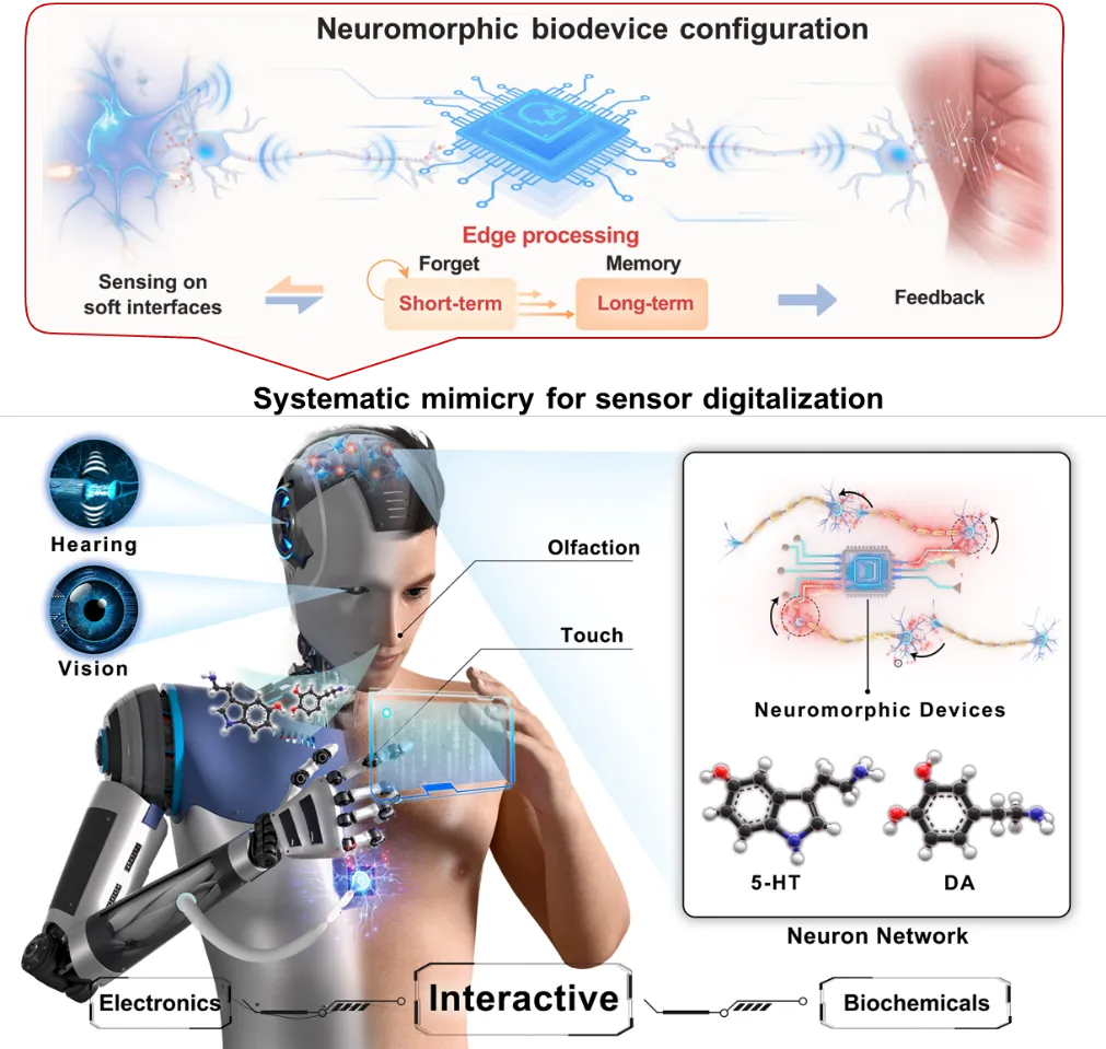 传感与信息技术的集成对生物电子学的发展至关重要。然而,随着传感器收集数据量的激增,传统信号处理方法面临效率和能耗方面的挑战,这推动了感知数字化技术的兴起。感知数字化是指将感官输入转换为数字信号,使数字系统能够处理、分析并利用这些数据,从而实现信息技术与物理对象、生物系统和环境的无缝融合。在生物体中,大量多模态感官输入信号通过神经网络的整合与处理,最终转化为我们的感知体验。同时,这些感官信号通过突触权重的调整逐步重塑神经网络,影响我们的认知和记忆。研究人员从生物系统的特征中汲取灵感,致力于将电导可调电子设备与柔性传感技术相结合以实现感知数字化,开发了各类模拟人类触觉和视觉的功能性感官—记忆系统。除物理信息外,化学信息如神经递质也在调节神经突触可塑性中起关键作用,理解并提取这些化学信使所传递的信息有助于更深入地了解大脑的工作原理与智能行为。因此,化学响应类神经形态系统的发展也正在快速兴起。这类系统有望赋予智能机器人类似人类的情感能力与心理特征以革新人机交互领域,实现人类与机器之间更加复杂和智能的交互。