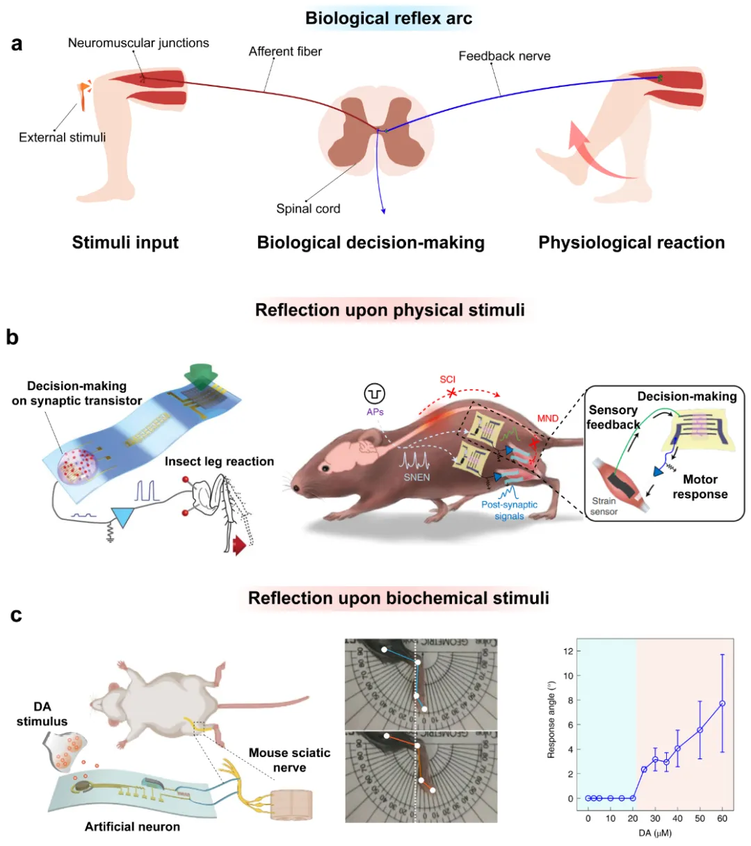 快速反馈对于生物体的环境适应至关重要,一个经典的例子是膝跳反射,其中大腿肌肉梭对机械拉伸刺激做出反应,通过股传入神经向脊髓发送神经冲动,最终导致腿向前踢。受生物体反馈系统的启发,研究人员致力于使用自主控制系统将神经形态系统连接到生物/人工传出神经,文中对这类系统的最新进展进行了报道与讨论,其在智能机器人、神经修复和智能假肢方面具有潜在的应用。