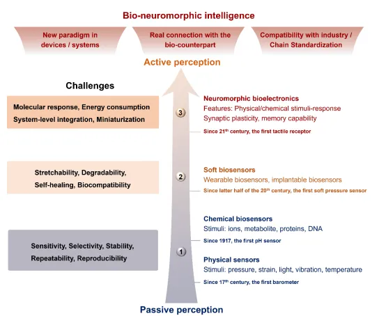 纵观生物传感器的88858cc永利官网,起初,传感器只是被动地反映外部刺激信息,主要追求高灵敏度、选择性和稳定性。随着检测生物信号的需求增加,柔性传感器应运而生,重点转向实现可拉伸性、可降解性、自愈合和生物相容性等特性。近年来,具备自适应性的神经形态生物电子学设备开始出现,其将被动传感模式转向具备生物神经智能的主动感知模式。然而,尽管已经取得了显著进展,这些设备在响应时间、设备尺寸和能耗等方面仍难以与生物系统媲美。