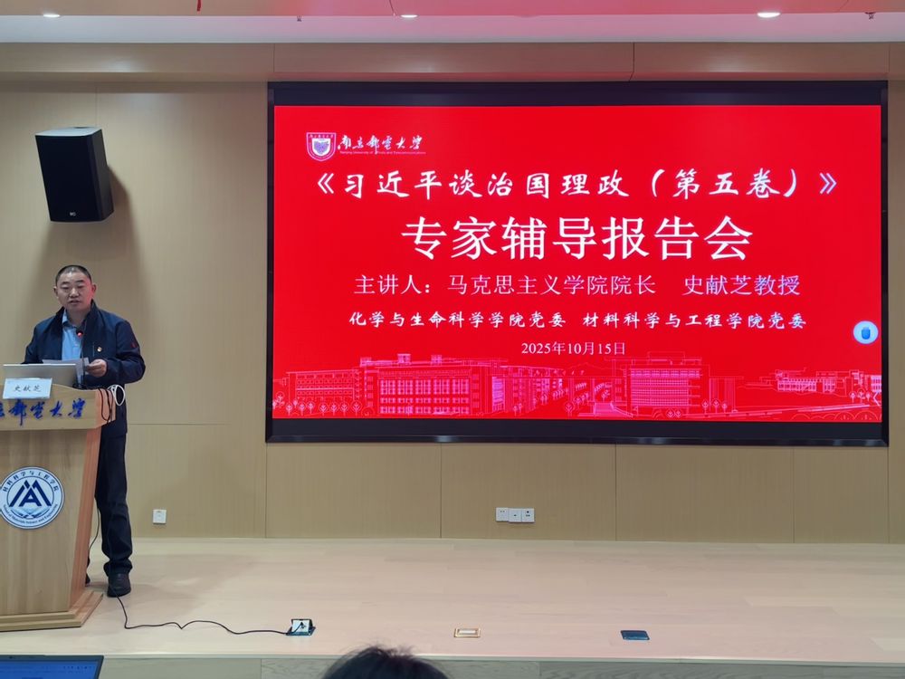 为深入学习贯彻习近平新时代中国特色社会主义思想,推动理论学习走深走实,10月15日,88858cc永利官网党委、材料工程与科学学院党委结对举办《习近平谈治国理政》第五卷专家辅导报告会暨专题读书班,读书班邀请到南京邮电大学马克思主义学院院长史献芝教授做专题报告会。两院理论学习中心组成员和全体教师党员参会,报告会由化生院党委书记乔祖琴主持,材料院党委书记高志华做总结并提出开展本次专题读书班的学习要求。